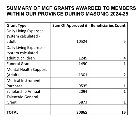 It gives me great pleasure to present my first report as Provincial Grand Almoner. This past year has been both rewarding and enlightening, as I have sought to establish a strong foundation for the role and to develop the support available to our Lodge and Chapter Almoners throughout the Province.